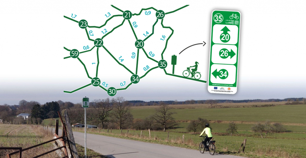 Le réseau repose sur un système de jalonnement et de numérotation des carrefours permettant de renvoyer les usagers vers d’autres intersections numérotées pour ainsi créer un itinéraire sur-mesure. Ce maillage est conçu pour offrir une liberté totale à tous les usagers, particulièrement les cyclotouristes. Il permet d’établir un itinéraire modulable en fonction de ses envies et de ses capacités.